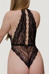 Siyah dantel bodysuit. Derin göğüs dekolte ve pencere sırt dekolte, boyun bağı, dantel detaylı bralette üst kısım, high leg brazilian, alttan çıtçıt kapama. |